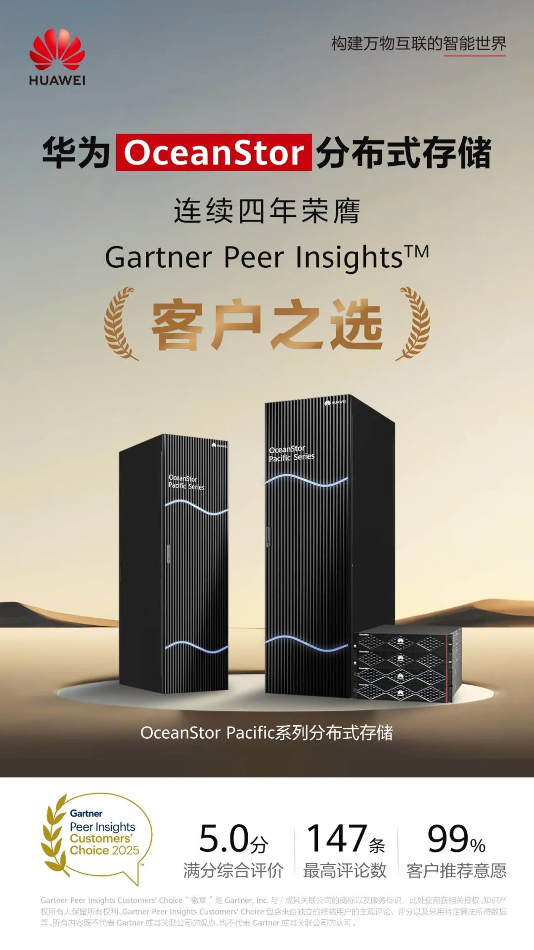 近日,全球权威咨询与分析机构Gartner发布《2025年Gartner Peer Insights 文件与对象存储平台“客户之声”》报告,华为OceanStor分布式存储再次登顶,连续第四年获得“客户之选”殊荣,彰显全球客户的认可。