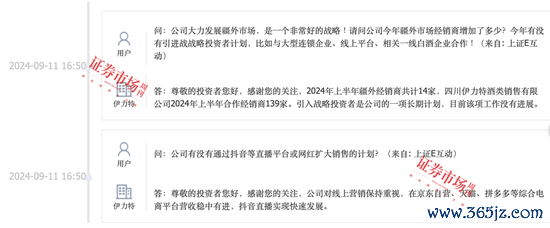 去年9月21日,有投资者在互动平台上提问:“大力发展疆外市场,是一个非常好的战略!请问公司今年疆外市场经销商增加了多少?今年有没有引进战略投资者计划,比如与大型连锁企业、线上平台、相关一线白酒企业合作?”