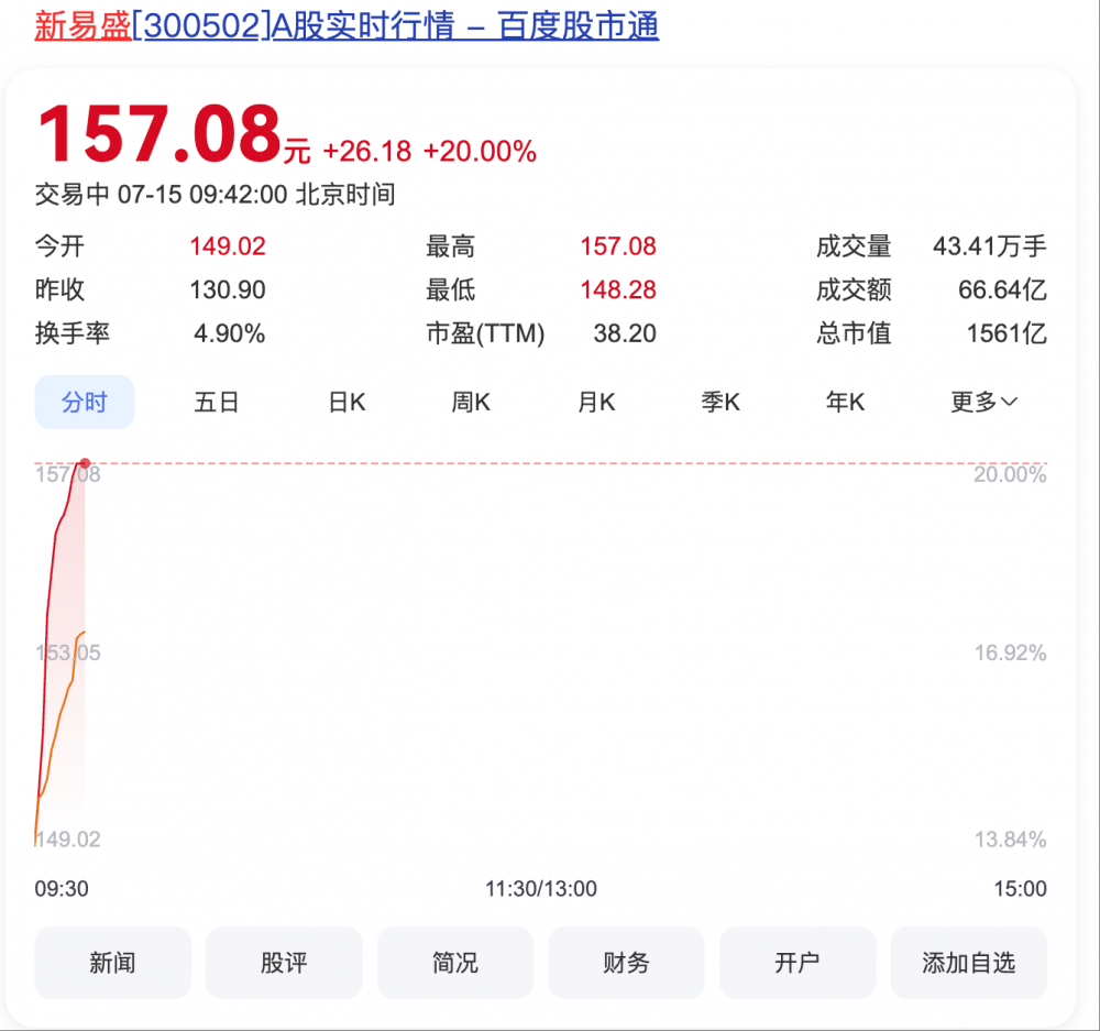 截至发稿,新易盛股价20cm涨停,创历史新高,总市值达1561亿元。
