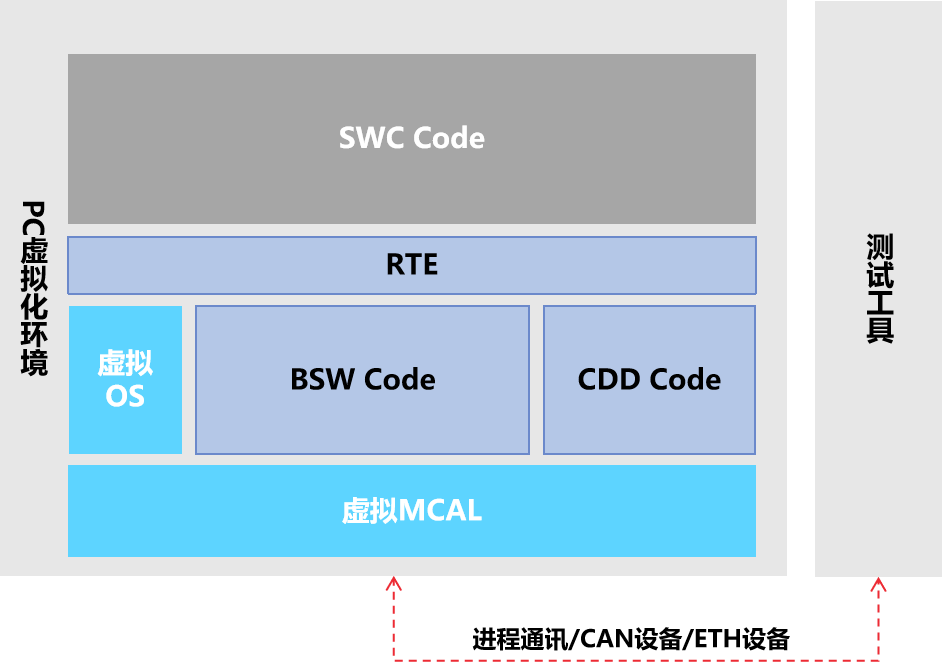 虚拟MCAL提供标准MCAL接口,确保BSW/CDD/RTE/SWC代码与目标板载代码一致